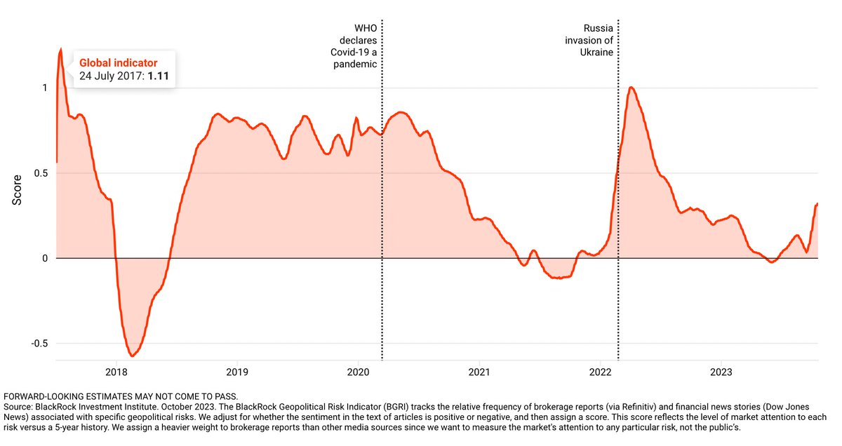 دومین نکته، میزان توجه بازارهای مالی به تنشهای ژئوپولتیک است. بر اساس شاخص BlackRock Geopolitical Risk Indicator (BGRI) که بر اساس میزان توجه بروکرها و موسسات مالی به تحولات ژئوپولتیک است، جنگ غزه نقطه عطفی ایجاد کرده اما «جهشی» ایجاد نکرده که موجب تحولات عمده در بازارها شود./۳
