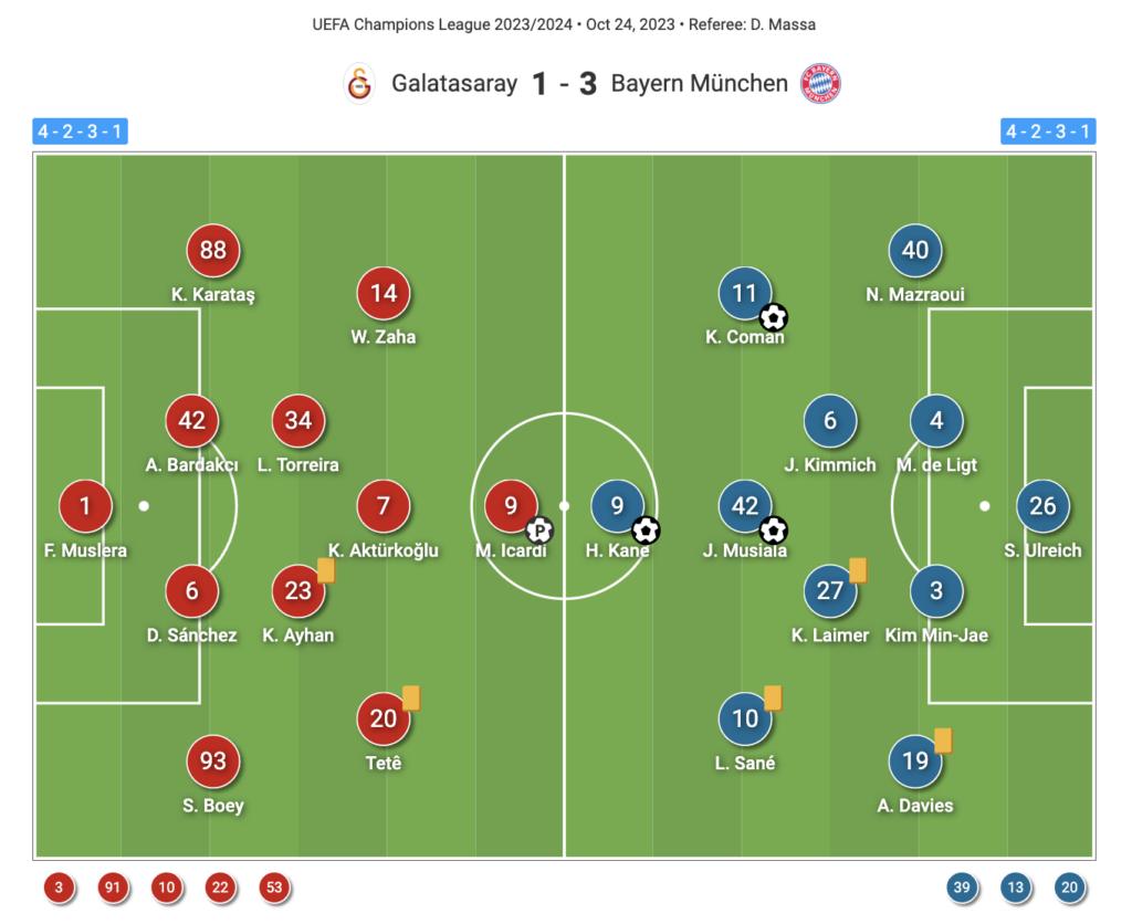 9 - Önde Harry Kane tarafından desteklenen Sane, Musiala ve Coman'ın hücum üçlüsü, Galatasaray'ın savunmasının bütünlüğünü test etti. Maçın ilerleyen dakikalarında Tuchel, sonucu daha da şekillendirmek için Sarr, Choupo-Moting ve Tel'i getirerek taktiksel değişiklikler yaptı.