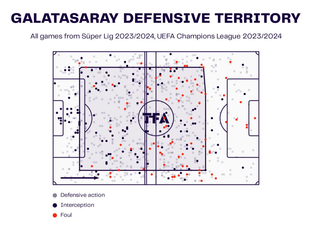 15 - Avrupa sahnesinde Galatasaray, yüksek baskı yoğunluğunu 6.4 değerinde tutarak PSG’nin hemen ardından ikinci en yüksek pres yoğunluğuna sahip oldu. Şampiyonlar Ligi'nde en düşük PPDA'ya sahipler. Bu, uyumlarını ve en üst düzeyde baskı yapma bağlılıklarını gösteren bir değer.
