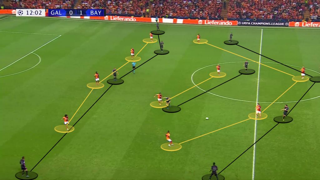 19 - Almanlar savunma kısmında yapılandırılmış bir 4-2 organize etmişti, ancak Galatasaray'ın amansız baskısı bunu göz korkutucu bir durum haline getirdi. Derinde oyunu kurma senaryolarında, Bayern sık sık pivot oyuncularının arkasındaki alandan yararlanamadı.