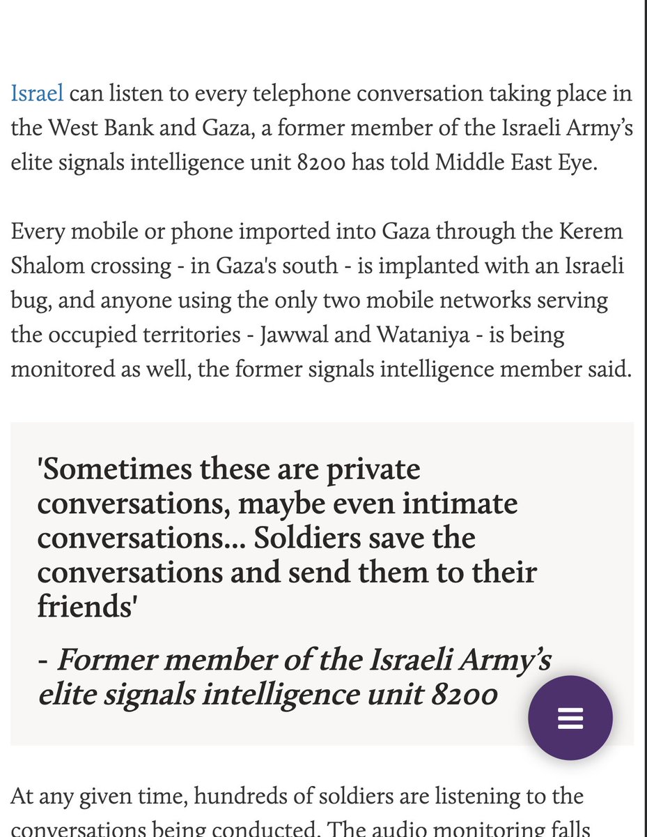 1\ Mass surveillance: Every single phone Israel allows into Gaza is implanted with an Israeli bug that allows them a back entry door into everything on that phone (e.g. camera, microphone, internet traffic, passwords, chat history...etc)
