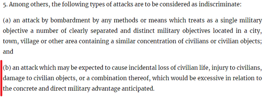 Now the tougher subjective rule of war Article 51.5b the so-called “proportionality” doctrine even though the word itself does not appear in IHL. Was Jabalia strike excessive in relation in relation to military advantage? Here is the language and analysis next. 6/