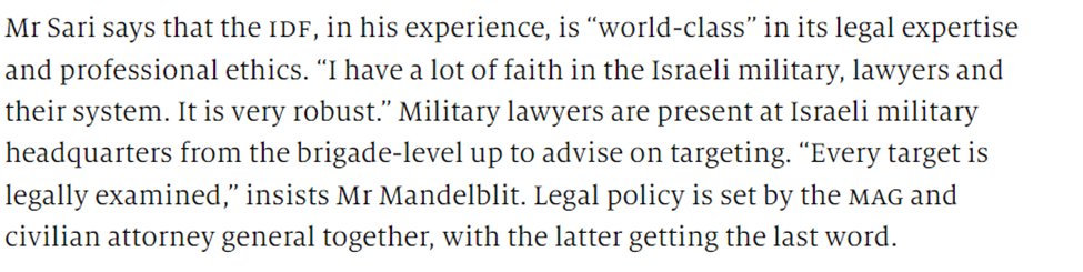 We also know that is Israel has robust legal experts embedded within IDF that reviews key strikes if not all. This is from The Economist. Those charging war crimes are not credible without detailed facts & analysis of each strike. 10/