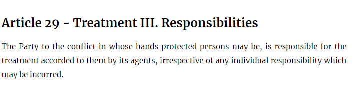 TWO: Hamas has an affirmative duty to be responsible for the treatment of "protected persons" meaning civilians. Hamas of course is hiding in tunnels & not providing its stocks of food or fuel or doing anything for civilians, violating Geneva IV Article 29. 3/