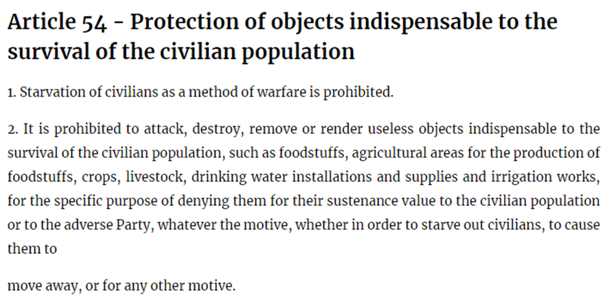 Let’s review key Geneva/IHL clauses where these concepts are covered. See Protocol I Article 54. Acts to starve civilians is prohibited but there is actually no affirmative duty to provide ANYTHING. Gazans have food & water and Israel is allowing these good in via Egypt. 2/