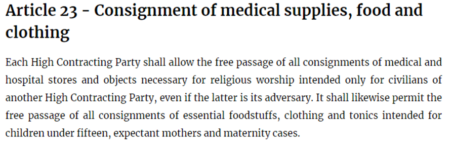 Article 23 creates affirmative duty to allow “free passage” of items limited to medical food & clothing & worship(!). Again no obligation in war to supply the other side's civilians, even food. It's not even suggested in IHL during war. UK did not need to feed Nazi Germany. 3/