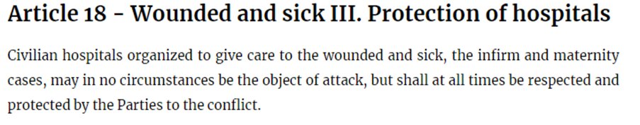 Hospitals are specifically noted in Geneva & protected per Article 18, they “may in no circumstances be the object of attack, but shall at all times be respected and protected by the Parties to the conflict.” But there's more... 3/
