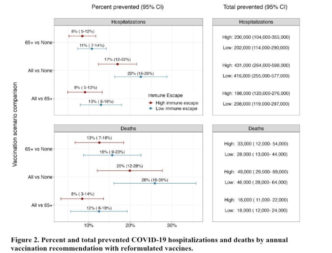 2) ... assumptions about immune escape (20% per year and 50% per year) and three possible CDC recommendations for the use of annually reformulated vaccines (no vaccine recommendation, vaccination for those aged 65+, vaccination for all eligible groups)"