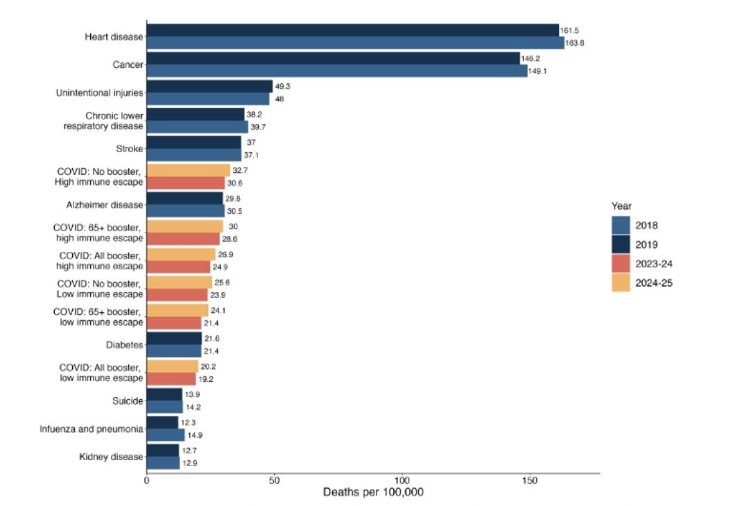 3) Comparison between the projected COVID-19 mortality by scenario and the 10 leading causes of pre-pandemic mortality in the United States