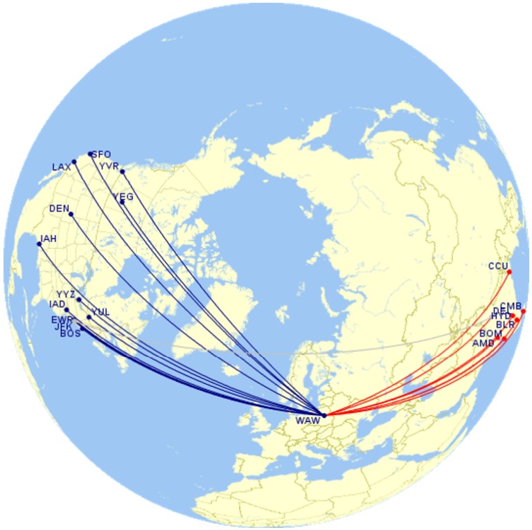 WAW leży dokładnie na najkrótszej linii łączącej Londyn z Delhi (tzw. Wielkie Koło). Czyni to z WAW wygodny punkt przesiadkowy dla pasażerów z 🇮🇳 🇱🇰 czy🇲🇻udających się do Europy Zachodniej – zwłaszcza jeżeli rozwinięta zostałaby szersza oferta lotów na subkontynent.