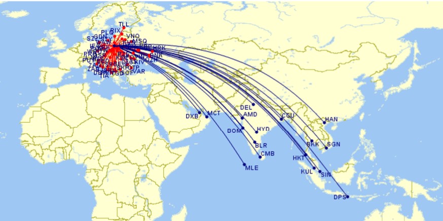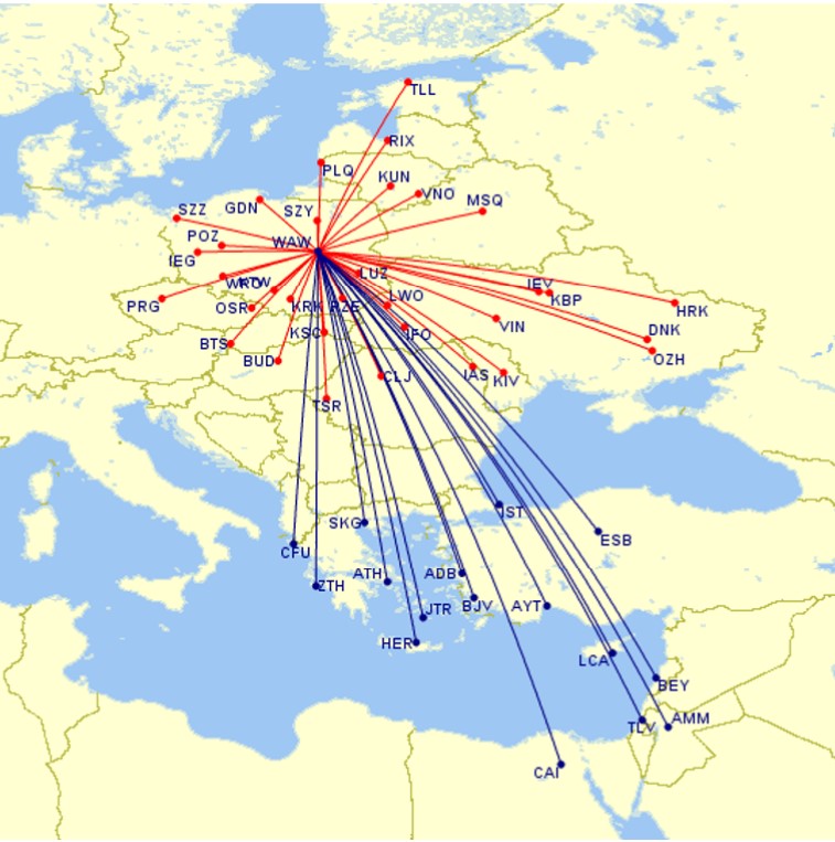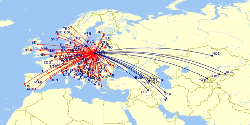 Tu mamy do czynienia z unikalną przewagą konkurencyjną WAW. W zasięgu samolotu B737 lecącego z WAW jest cały Kaukaz oraz Azja Środkowa. Ze względu na odległość, nieliczne połączenia z Europy Zachodniej do tego regionu mogą operować wyłącznie na samolotach szerokokadłubowych (np. A330 czy B787). Operator z Polski dysponuje zatem ogromną przewagą kosztową nad konkurencją, co czyni Warszawę naturalnym portem transferowym dla tych strumieni pasażerskich.