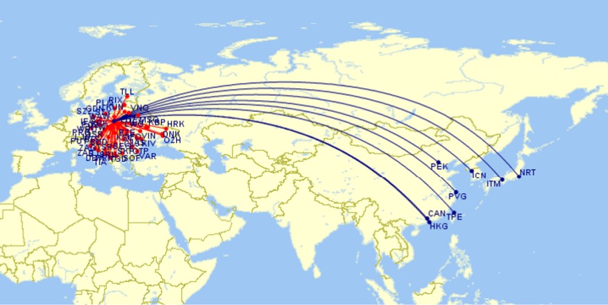 Ze względu na ograniczenia bilateralne (limit częstotliwości), protekcjonistyczną politykę 🇨🇳, zamknięte niebo nad 🇷🇺, nie zakładam dynamicznego rozwoju w tym kierunku. W innej rzeczywistości politycznej moglibyśmy prawdopodobnie liczyć na więcej połączeń do 🇨🇳. W obecnej sytuacji nawet kierunki zaznaczone na mapie należy traktować jako co najmniej pod znakiem zapytania❓