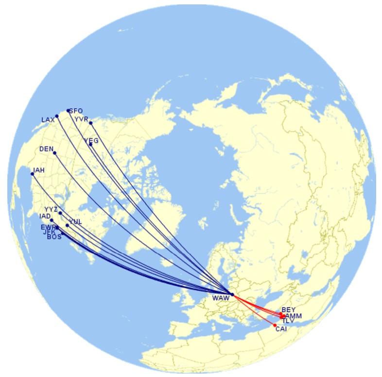 WAW leży na najkrótszej linii łączącej Bliski Wschód z Ameryką Północną. Czyni to WAW już w tym momencie kluczowym hubem transferowym np. dla pasażerów transferowych z Tel Awiwu do Nowego Jorku.