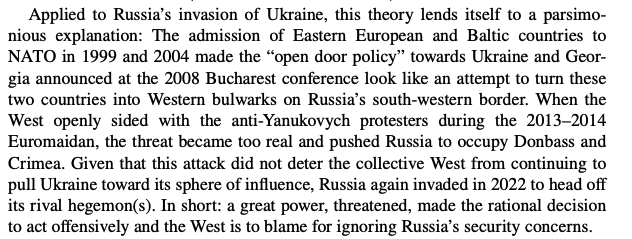 Yet between the invasions in 2014 and 2022 there seems to have been little effort made by the realists to bridge this gap by engaging with area studies and the empirics of Ukrainian, Russian, or Eastern European politics. In 2022 Mearhseimer was singing the same old song.