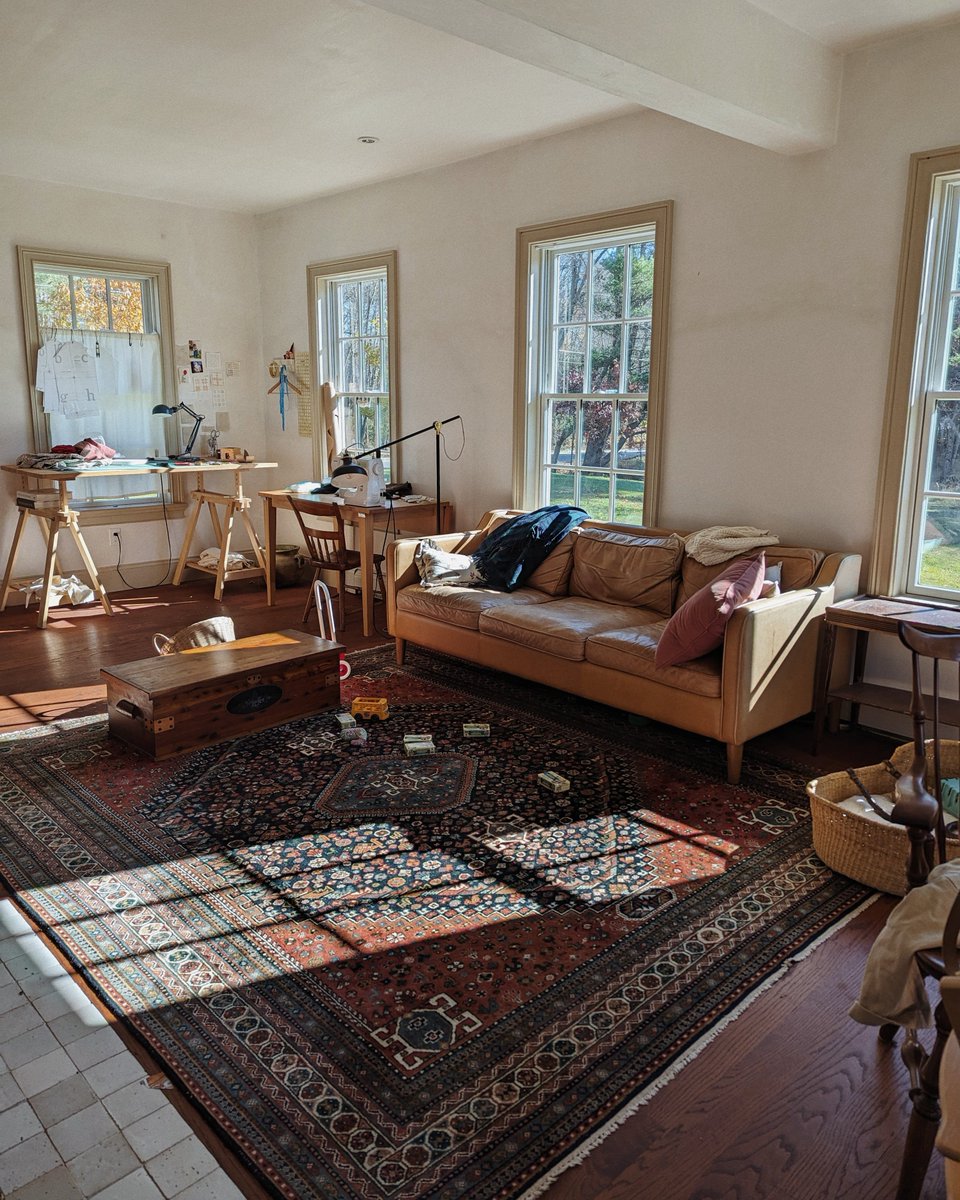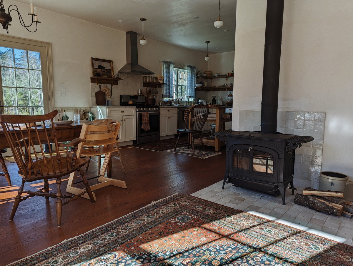 you can see part of Simi's sewing setup (because the studio room is now mostly my home office) and the beam that's where a wall would be there if we did not decide at the last minute to make the downstairs an open L shape so the wood stove could heat everything