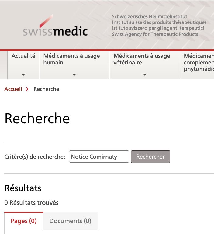 ❌La recherche « Notice Comirnaty » sur le site donne 0️⃣, rien !
