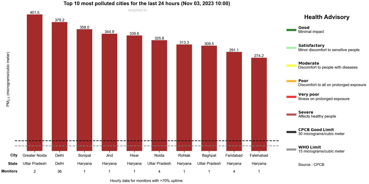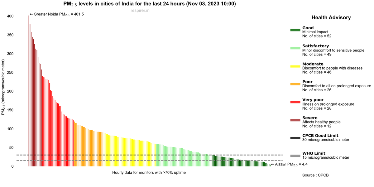 🔴'Severe’ air quality (PM 2.5 >250) was reported at 51 monitoring stations, almost all in Delhi-NCR.