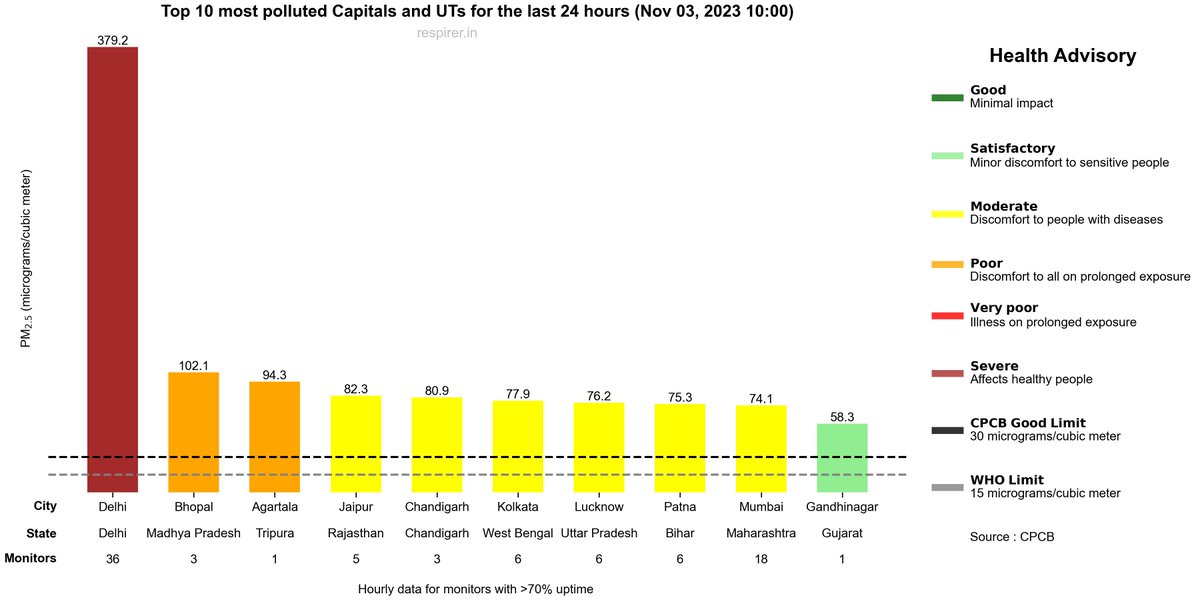🔴Delhi was still the most polluted state capital in the last 24 hours, but Bhopal, at third place on November 2, climbed up to second place yesterday, its PM 2.5 inching up to 102.1.