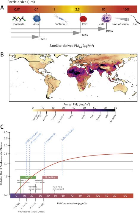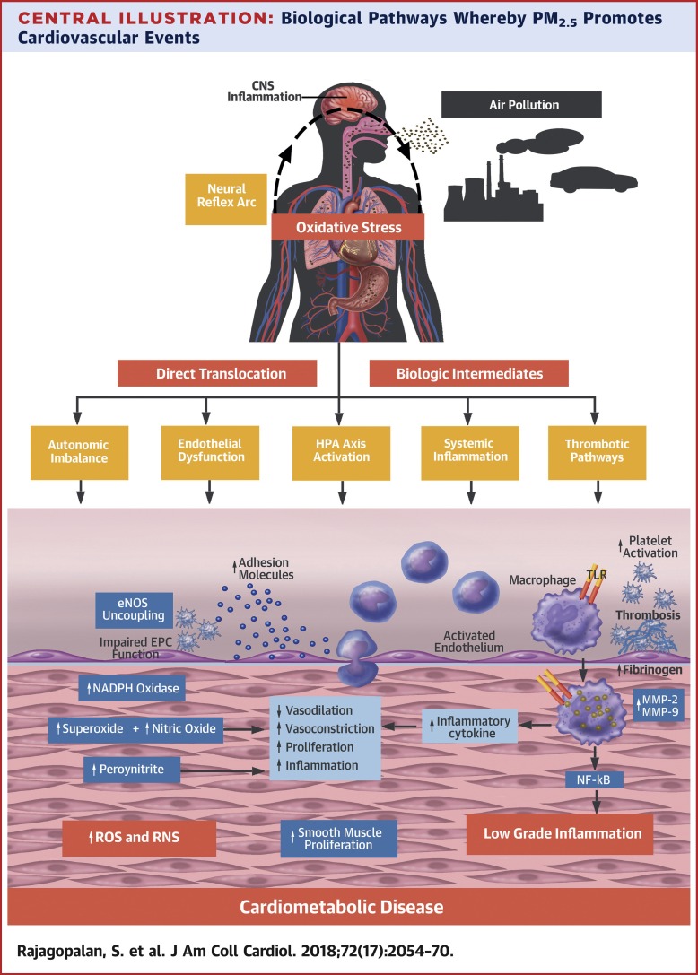 Higher levels of fine particulate matter (PM2.5) lead to endothelial dysfunction and slow flow in coronaries and systemic inflammation, leading to accelerated atherosclerosis and thrombus (clot formation).