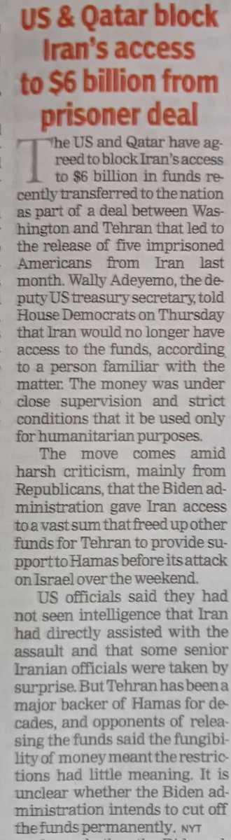 The US and Qatar blocked Iran's access to USD 6 Billion hostage exchange money.