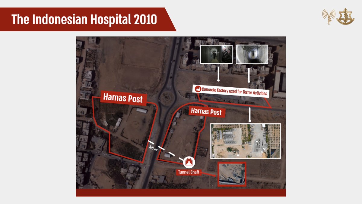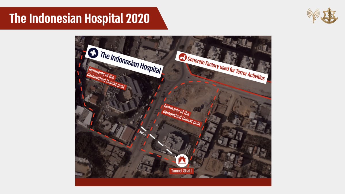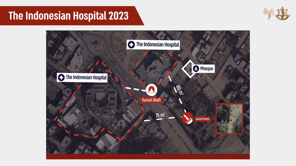 Der IDF-Sprecher teilte mit, dass Geheimdienstinformationen auf ein unterirdisches Tunnelsystem hinweisen, das sich unterhalb des sogenannten indonesischen Krankenhauses erstreckt. Zudem präsentierte er Luftbildaufnahmen, auf denen Raketenabschussvorrichtungen in unmittelbarer