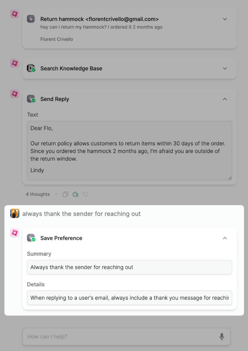 6/ Lindies continuously learn from their interactions with both you and other Lindies. Here, I give feedback to my Support Agent Lindy on how to best communicate with our customers: Image