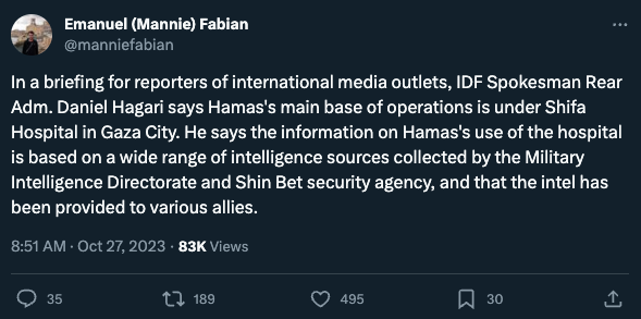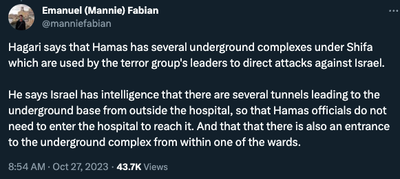 I'm inclined to believe this claim because (1) it is absolutely exactly the sort of thing Hamas does; (2) the reporting on this has been persistent and broad; (3) I am extremely doubtful Israel would deliberately blow up a hospital unless they had a strong operational reason for doing so, especially given the blowback they got the last time they were accused of striking a hospital.