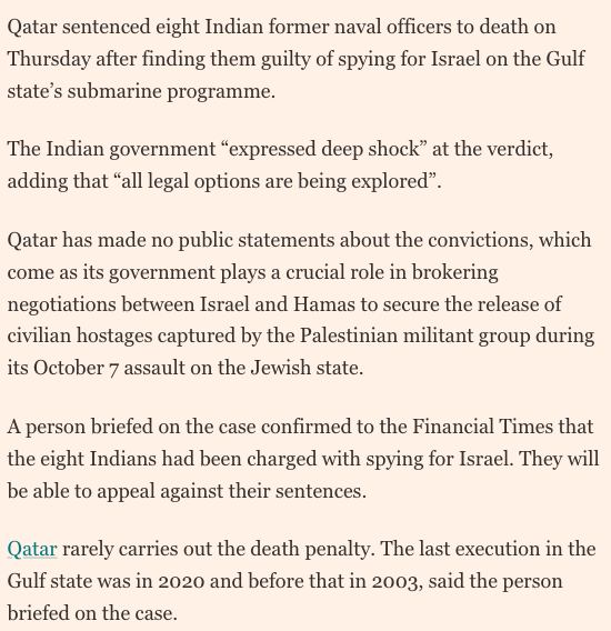 Qatar has sentenced 8 Indian nationals to death on charges of spying for Israel. I somewhat doubt they are going to be executed; this is being done for messaging purposes. I have no insight as to what the message is intended to be, nor to whom it is for. It might be an attempt to pressure some party to bargain harder on some other matter.