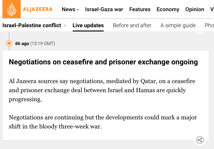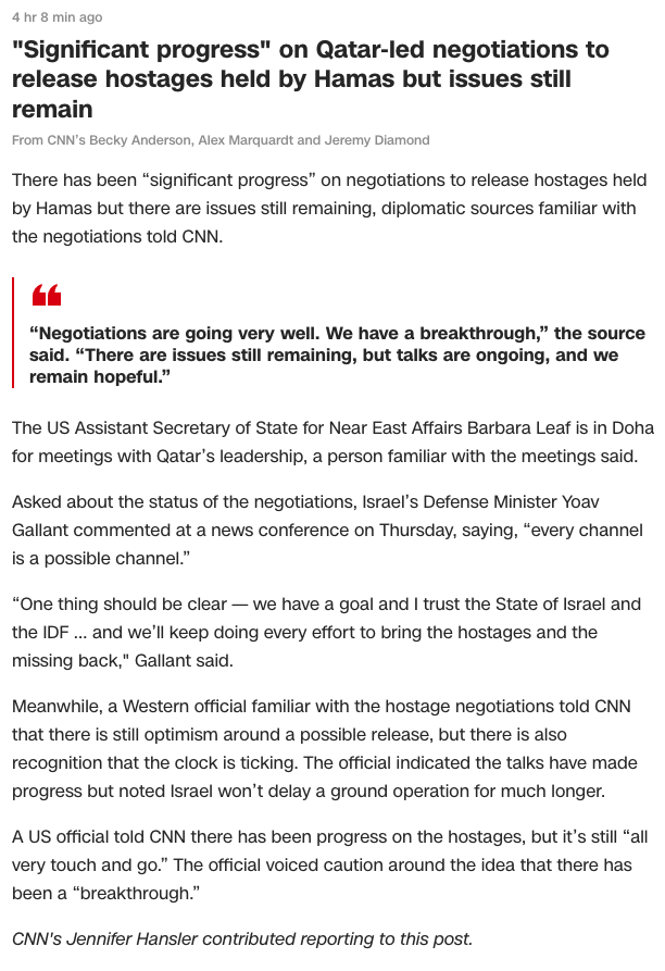 Alternatively, this kind of leak could be laying the groundwork for Israel to break off the talks at some point near in the future, given that Hamas is in fact probably not going to be releasing the hostages en masse anyway.