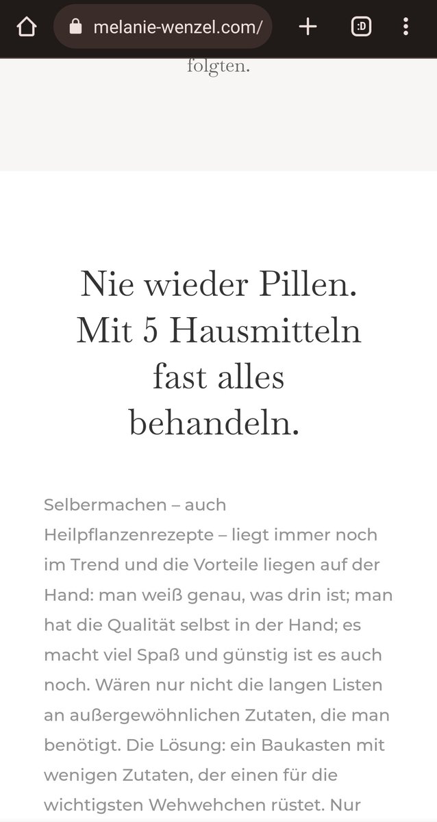 „Nie wieder Pillen. Mit 5 Hausmitteln fast alles behandeln.“ heißt es dann noch verheißungsvoll auf ihrer Homepage, als Werbung für ein Buch.