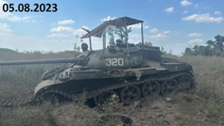 The same issues with not being able to geolocate or confirm the nationality. I was unable to find the original source, though the posting twitter account says the vehicle type is unclear (I agree) and Oryx says its a T-62M. Image