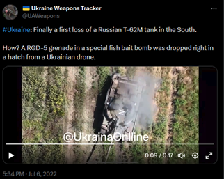 A video showing a grenade sized explosive being dropped from a drone into the open driver's hatch. This is probably Russian due to a Z on the roof.