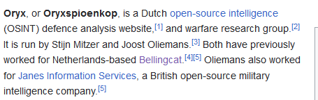 Oryx is well touted by institutional and mainstream media sources for an independent and open source verifiable low end accounting of equipment losses in the Ukraine War.