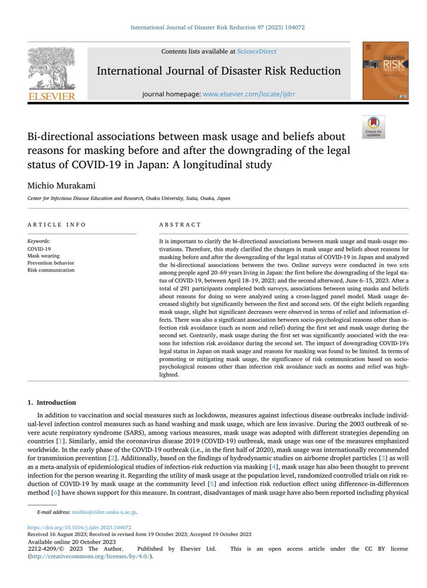 Journal of Disaster Risk Reduction analysierte ein Forscher der Universität Osaka die Verwendung von Masken vor und nach der Herabstufung des gesetzlichen Status von #COVID19 durch die japanische Regierung. Die Ergebnisse zeigten, dass viele Menschen aus sozio-psychologischen