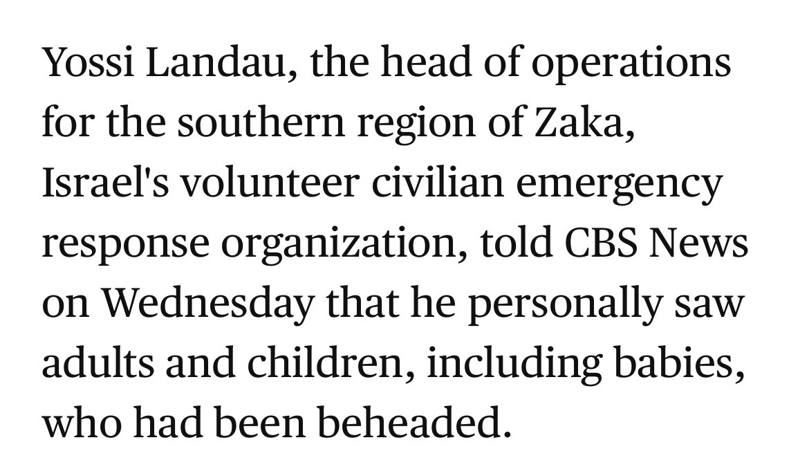 CBS News now citing a secondary direct source for their reporting that children’s bodies were among those found beheaded at Kfar Aza: cbsnews.com/live-updates/i…