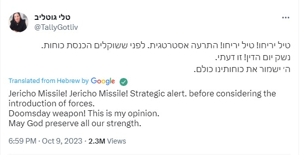 Che poi non è manco er primo: l’aveva già detto er 9/10 Tally Gotliv, membro della Knesset e der Likud invocando i missili Jericho su Gaza. Ma noi pe’ scandalizzacce dovevamo aspettà armeno un ministro. E questa è esperta in expert in "criminal law and fundamental rights". >>