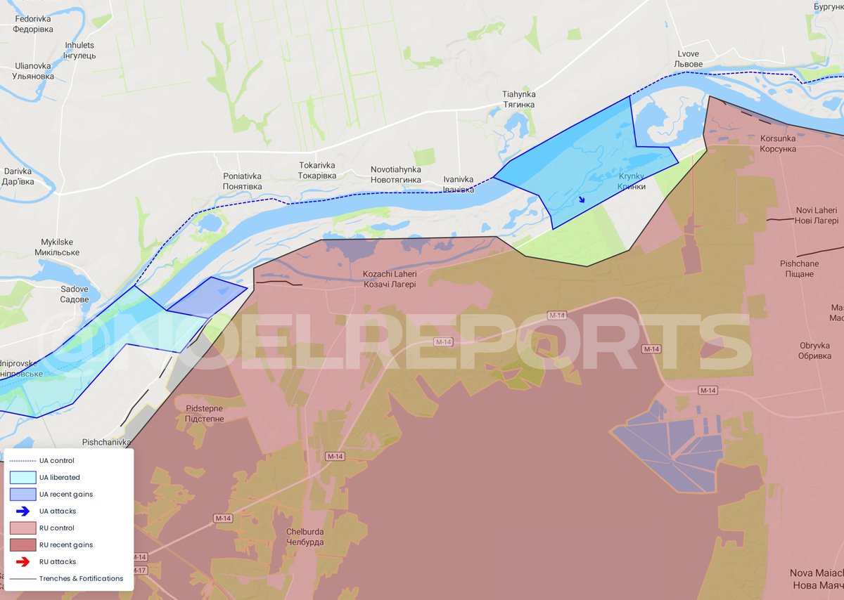 ➡️Russian sources claim Ukrainian troops are moving south from Krynky near the forest area towards the T2206/M14 motorway. Gray zone expanded.