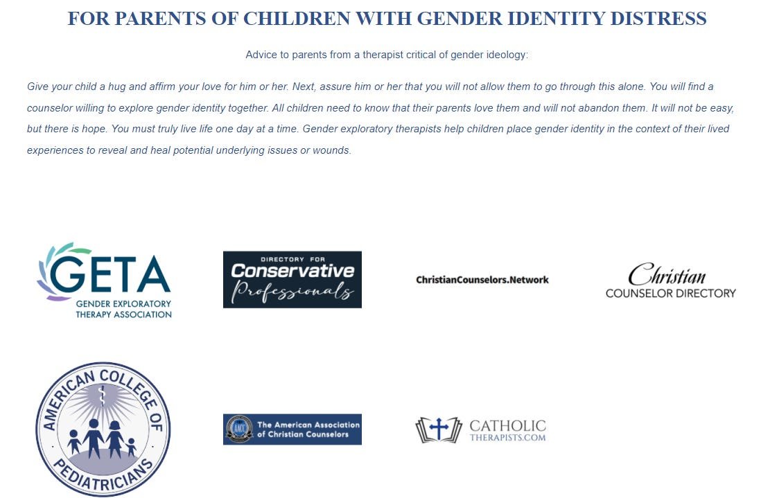 The initiative features Gender Exploratory Therapy heavily, alongside several other known conversion therapy organizations, such as the "Christian Counselors Network" which offers referrals to 100 conversion therapists for "homosexuality issues" and "gender identity issues"