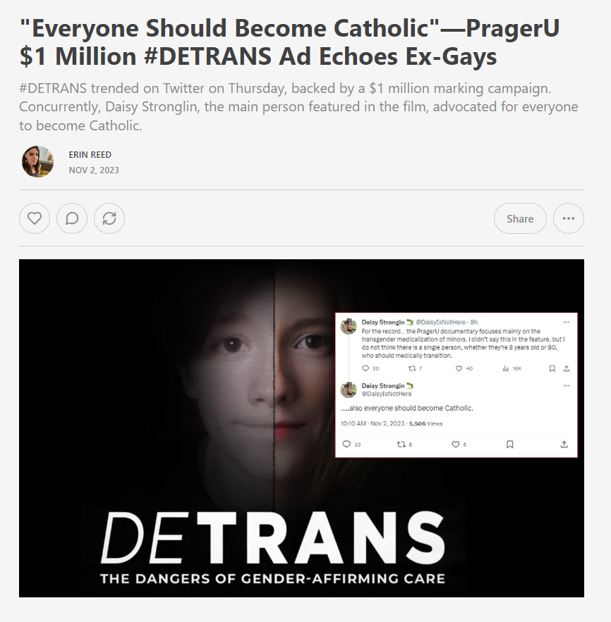 The main subject, a detransitioner named Daisy, announced "everyone should become Catholic" and advocated against transition "at any age."