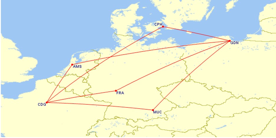 GDN posiada dość rozbudowaną siatkę połączeń do ~50 lotnisk w Europie. Dziennie obsługuje 50-80 lotów (XI.23)