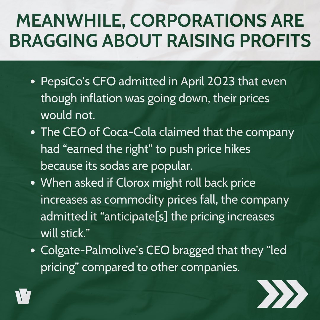 While inflation has slowed recently, prices for everyday items have not. That’s because between 2020 and 2022, corporate profits rose by 75 percent—five times as fast as inflation. /2