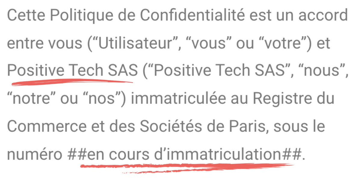 Première étape, on va voir dans la politique de confidentialité de l'appli : il est bien fait mention d'une société Positive Tech SAS... qui n'existe pas juridiquement.