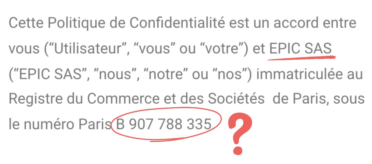 Cependant, le numéro d'immatriculation est faux (il correspond à une autre société) et aucune trace d'EPIC SAS n'existe dans les publications administratives en France.