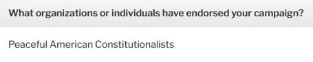 If you go to the section titled "What organizations or individuals have endorsed your campaign?" on her Candidate Connection survey, you will see that Peaceful American Constitutionalists endorsed her.