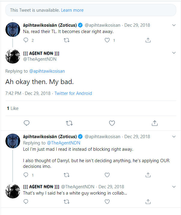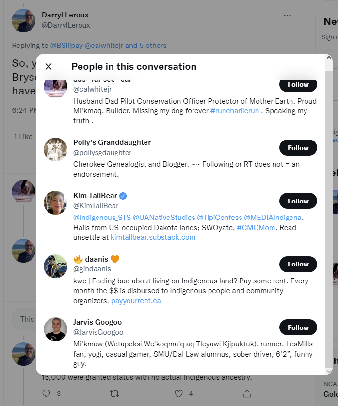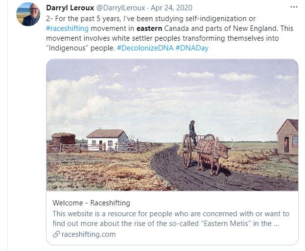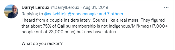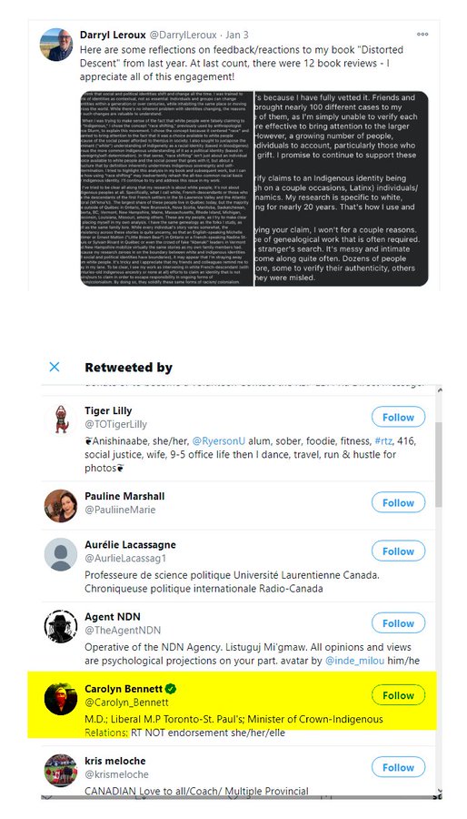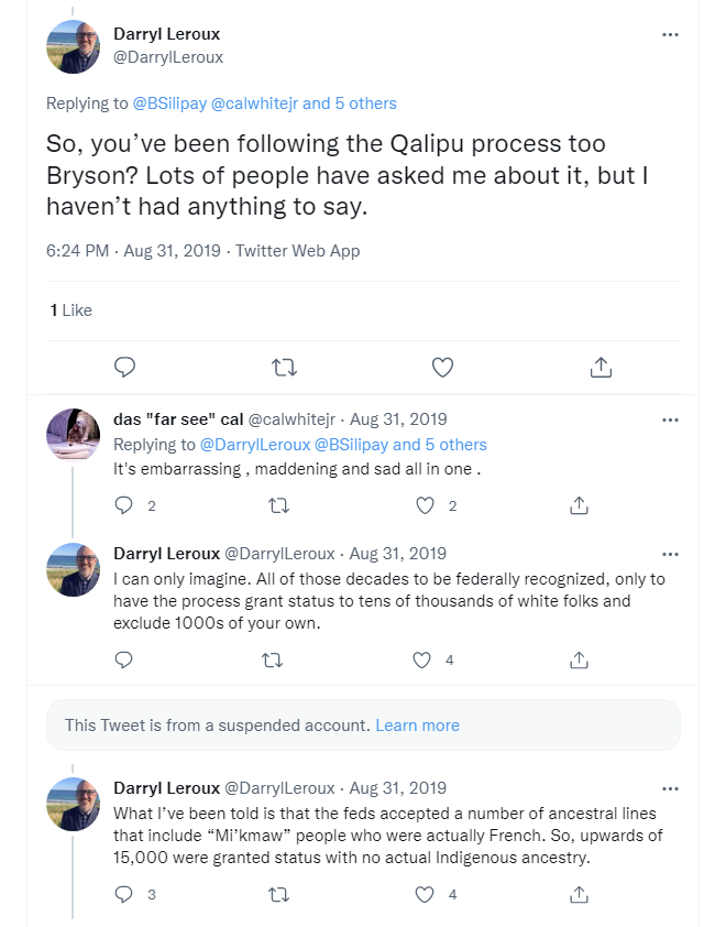 KimTallbear and Darryl in a tweet talking about Qalipu not being Indigenous - by French I think he means Acadian. So it seems in Manitoba one can be French, Scottish and also Indigenous but not anyone who doesn't pay him? lol