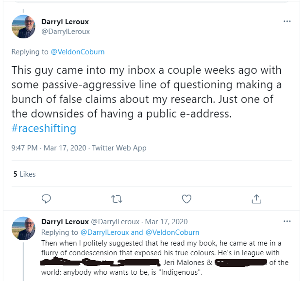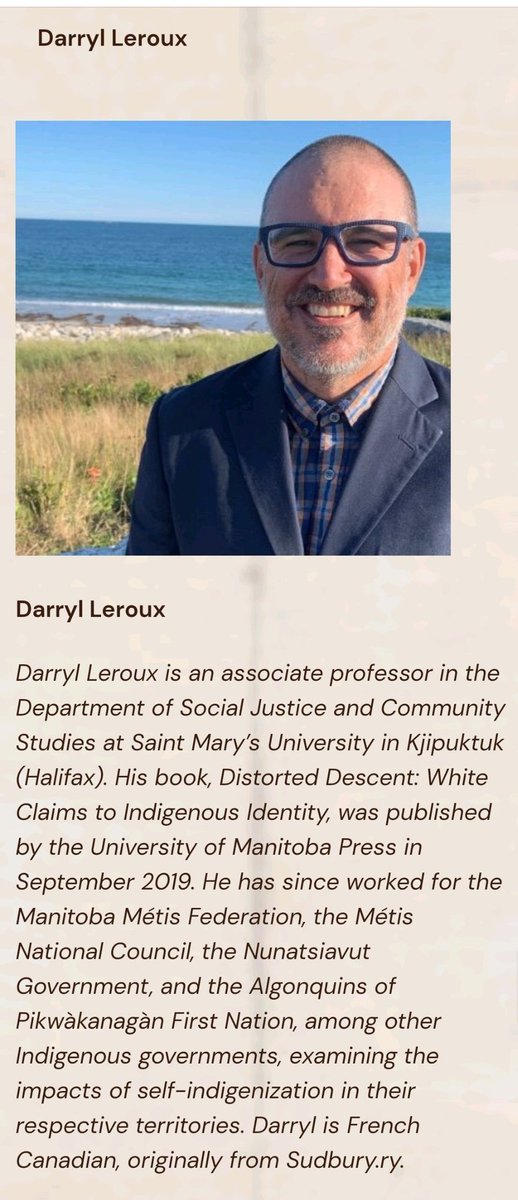 Because surely he wouldn't be using one measuring stick against one set of Indigenous people and not the exact same rigorous Academic standards against another? Darryl Leroux Academic - saying French Descent equals white - white doesn't equal Indigenous. Do you think he feels the