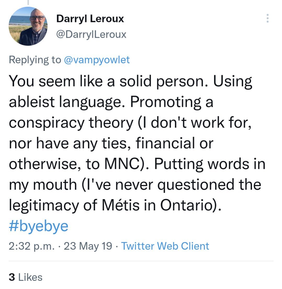 "Darryl saying he has never said all Eastern Metis were non-Indigenous and or white."/ "Darryl Leroux saying Eastern Metis are not indigenous." Seems he forgot which pocket he was in that day, LOL