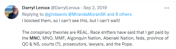 "Darryl working for MNC, MMF etc " "Darryl saying again he has never worked for MNC." "Darryl saying he never worked for mnc, mmf etc." "MNC , Darryl and Mi'kmaw having a panel to discuss Eastern Metis." You starting to see a pattern yet?