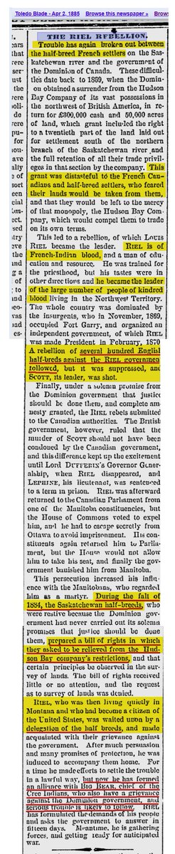 Toledo Blade - Apr 2, 1885 pg2 of 7 - The Riel Rebellion - Trouble has broken out between half-breed French settlers on the Saskatchewan River and the gov of Dominion of Canada.. Hmmm French Settlers? Those French and Scottish Metis white settlers? (*sarcasm alert)