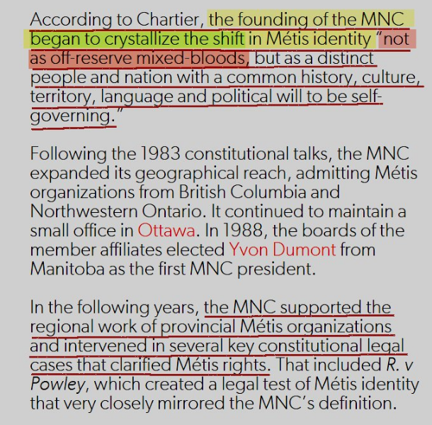 Chartier - founding of MNC began to crystallize the "shift" in Metis identity - not as off reserve mixed-bloods-but as a distinct people .... so one can raceshift into a different people if one has the support of the Liberal Gov and Leroux?